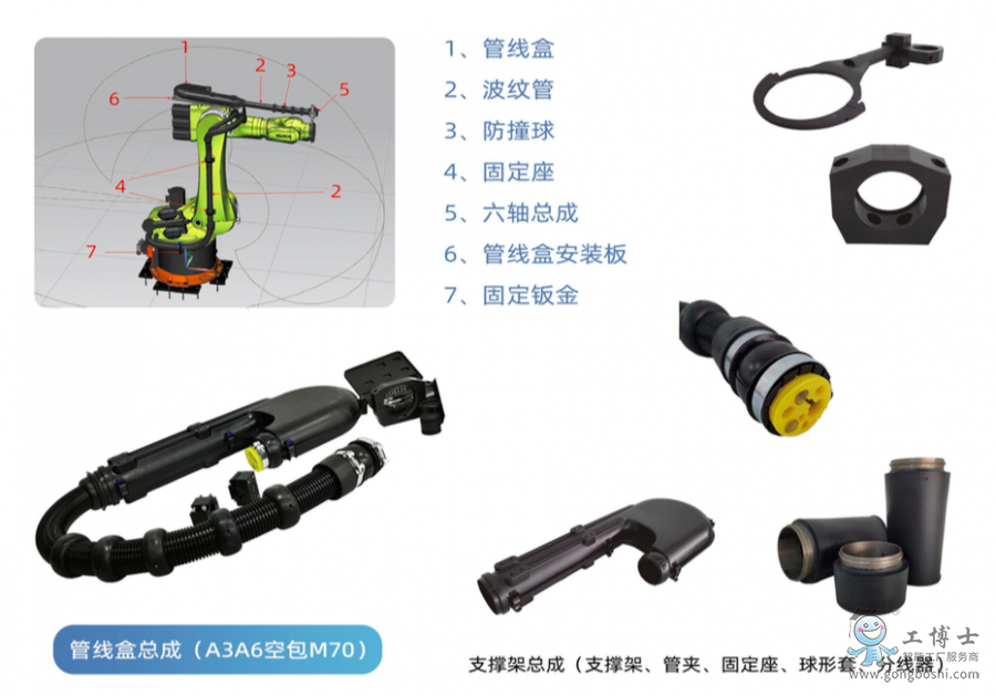 工博士機器人管線包包括7個組成部分:管線盒、波紋管、防撞球、固定座、六軸總成、管線盒安裝板和固定鈑金。組件中波紋管為德國進口,其他組件均為國產定制。