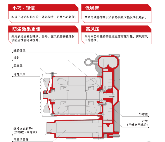 用這些裝置,從吸氣口吸入空氣,通過葉輪使其加速,再通過離心力的作用撞擊內壁,再次反彈回到葉輪金屬板的底部,該過程葉輪的運轉反復進行,使能量持續倍增,吸入的空氣得到加速。其整體效果并非和用多段裝置來獲得不同。但用富士鼓風機通過葉輪的運轉而產生的更多的再生循環,可得到更大的輸出。為滿足特定的要求,這些送風機可進行多樣化的組合。