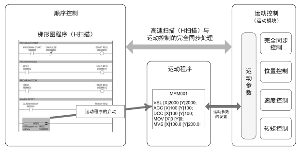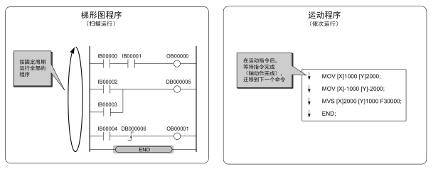 運行程序所寫的指令和MP2000系列高速掃描做完成同步處理,運行程序啟動沒有延遲,可以在一個掃描周期內完成梯形圖的起始信號到軸動作為止的系列指令。