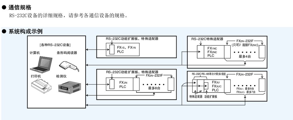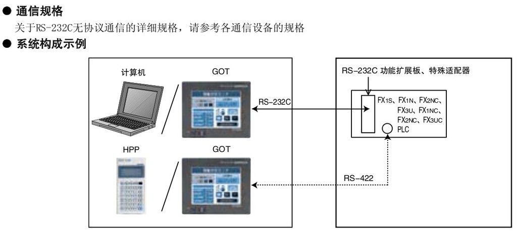 具有RS-232C規格的接口,可以和打印機、條形碼閱讀器、或者各種串口設備等通信。使用順控程序,以無協議的方式執行通信。