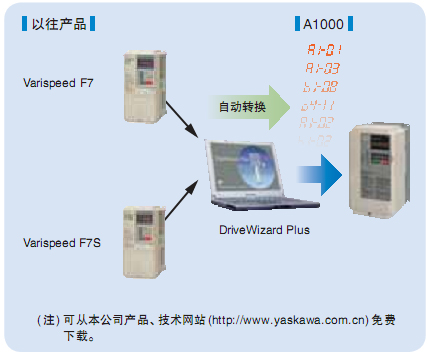 | ■ 從以往產品自動轉換參數的驅動器更換功能,在更換變頻器時,或萬一發生故障進行更換時可省去參數設定的作業 |