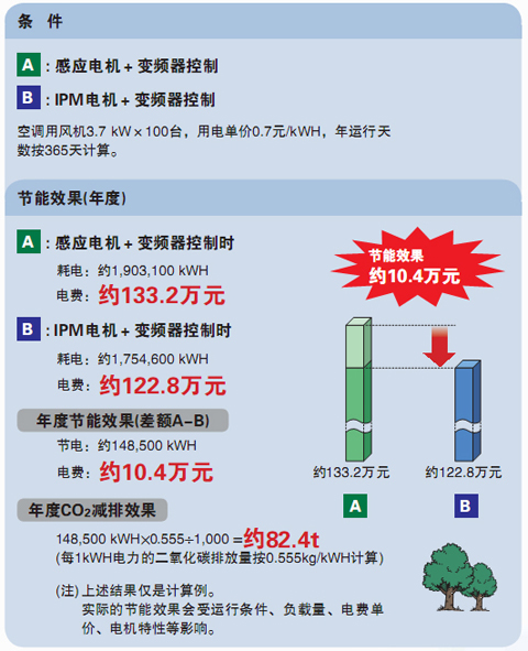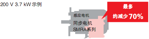| 高效率的同步電機和變頻器的節能控制同時使用,可以超越感應電機,實現超級節能。 | |