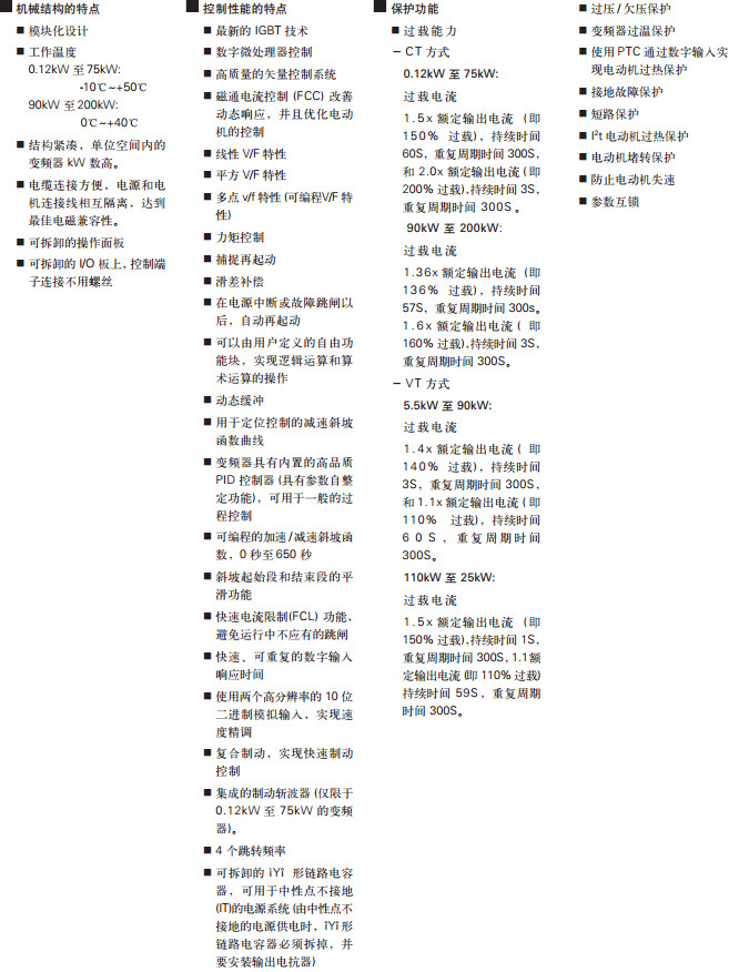 調試簡單模塊化的結構,因而其配置具有*大的靈活性6個可編程,帶隔離的數字輸入2個可標定的模擬輸入(0V至10V, 0mA 至20mA),它們也可作為第7和第8個數字輸入2 個可編程的模擬輸出(0mA至20mA)3 個完全可編程的繼電器輸出(30V 直流/5A,阻性負載;250V 交流/2A,感性負載)當使用較高的開關頻率時,電機可以低噪音運行(在開關頻率較高的情況下,要降格使用)完善的變頻器和電動機保護功