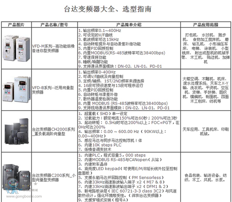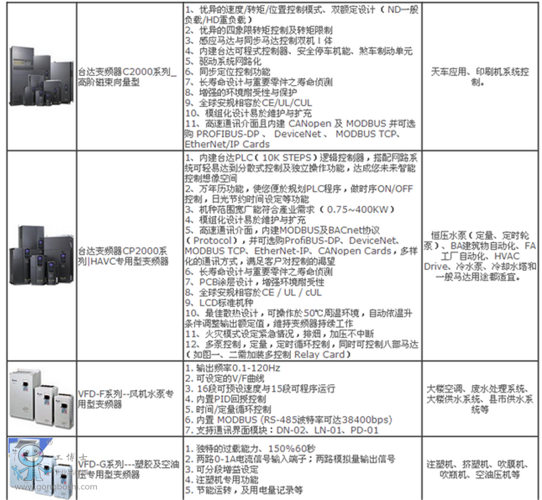 本系列產品主用于打包機、 水餃機、 跑步機、 農業養殖溫濕度控制風扇、 食物加工攪拌機、 磨床、 鉆孔機、 小形油壓車床(3HP以下)、 電梯(2HP)、 涂裝機、 小型銑床(平面加工3HP)、 射出成型機的機械手臂(夾取)、 木工機(兩面刨床)、 貼邊機、加彈機 ▲ 輸出頻率0.1~400Hz