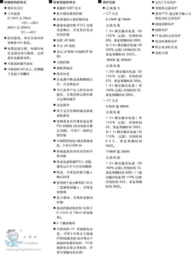 調試簡單模塊化的結構,因而其配置具有*大的靈活性6個可編程,帶隔離的數字輸入2個可標定的模擬輸入(0V至10V, 0mA 至20mA),它們也可作為第7和第8個數字輸入2 個可編程的模擬輸出(0mA至20mA)3 個完全可編程的繼電器輸出(30V 直流/5A,阻性負載;250V 交流/2A,感性負載)當使用較高的開關頻率時,電機可以低噪音運行(在開關頻率較高的情況下,要降格使用)完善的變頻器和電動機保護功能