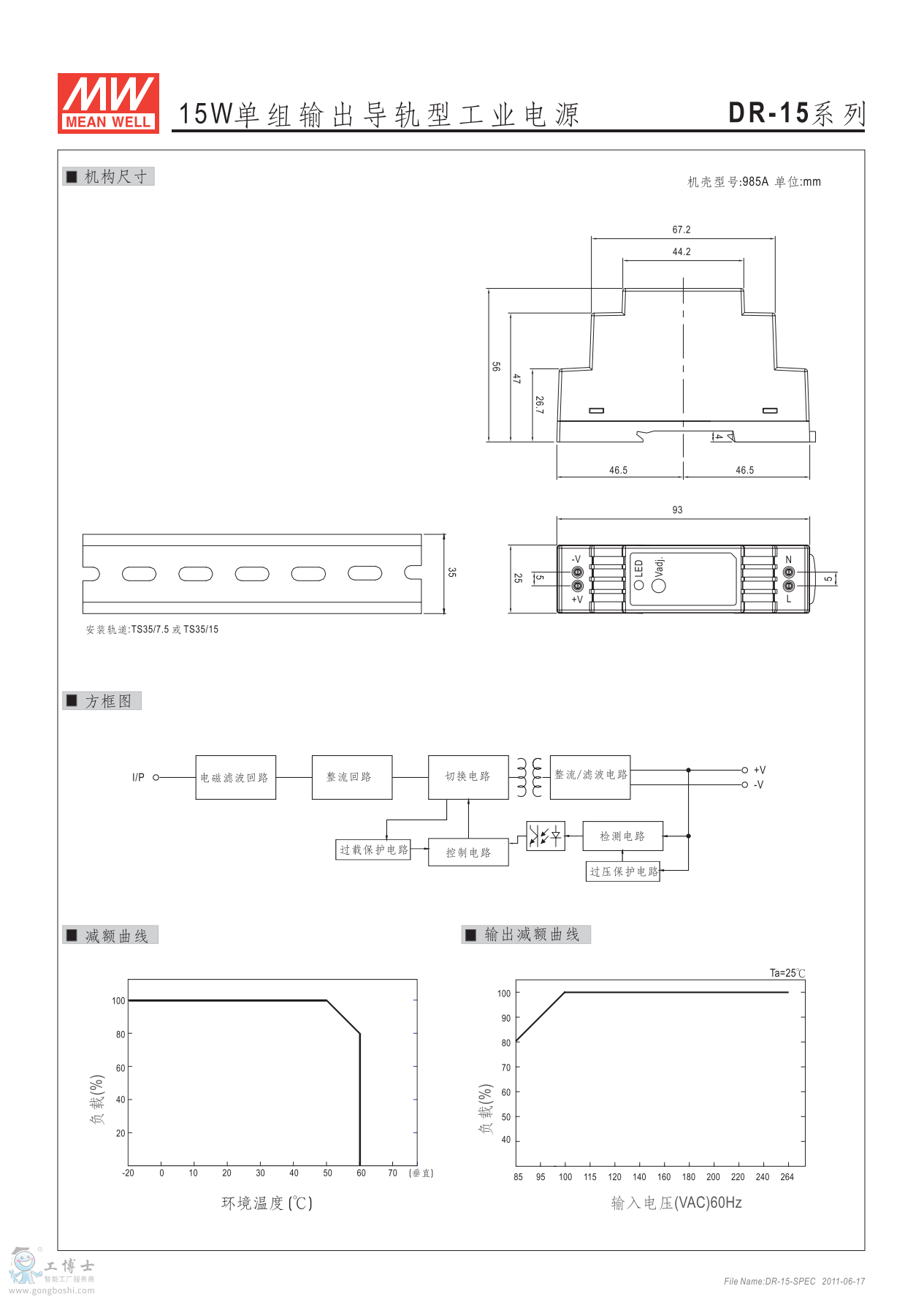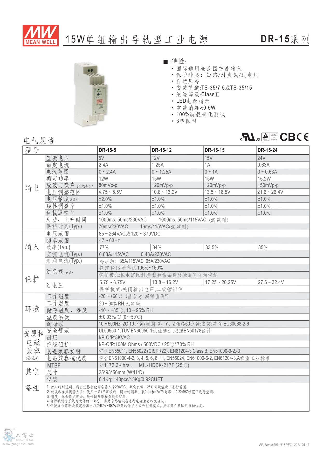 meanwell明緯導(dǎo)軌型 DR-15-5 15W單組輸出 |