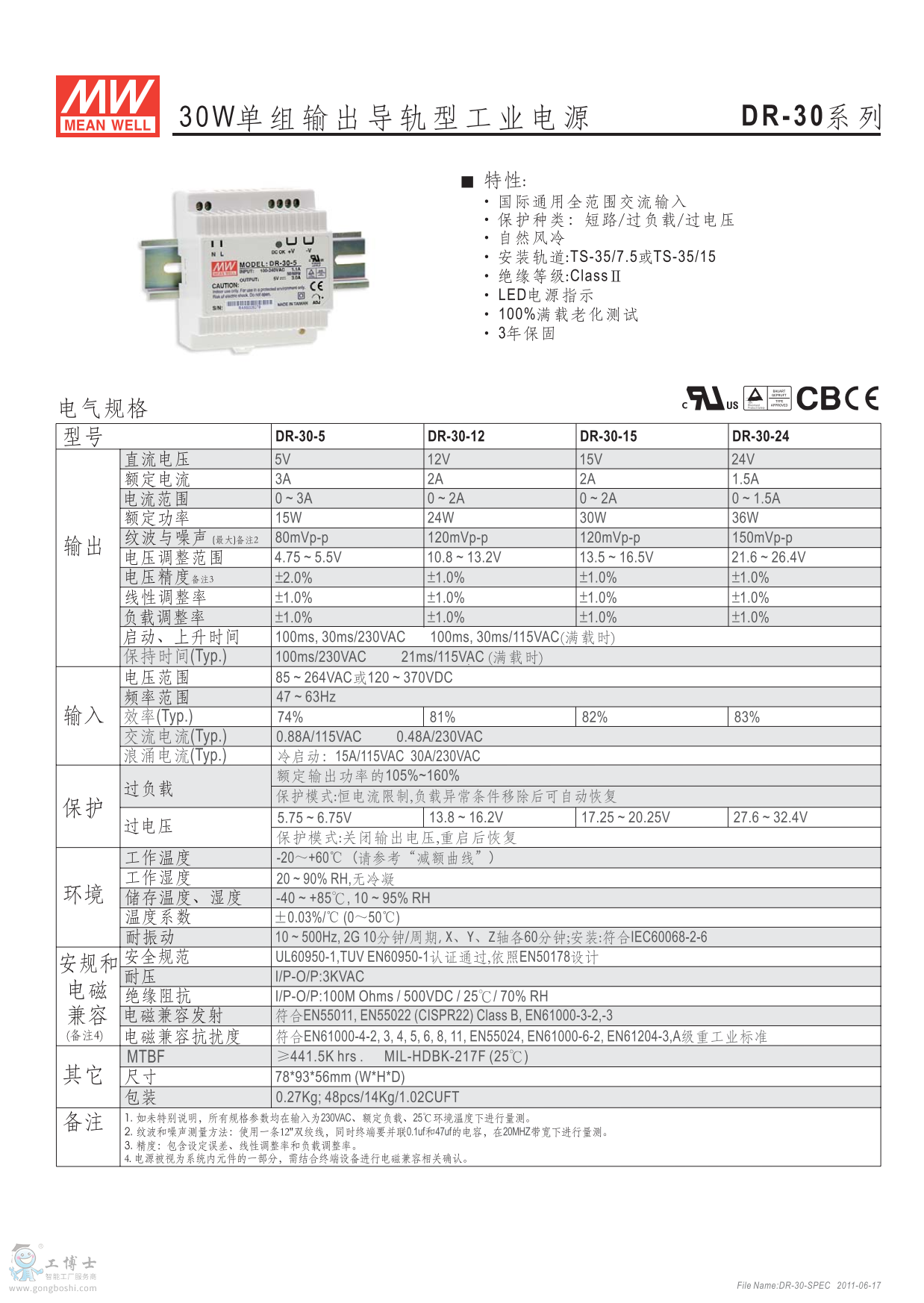 meanwell明緯導軌型 DR-30-15 30W單組輸出 |