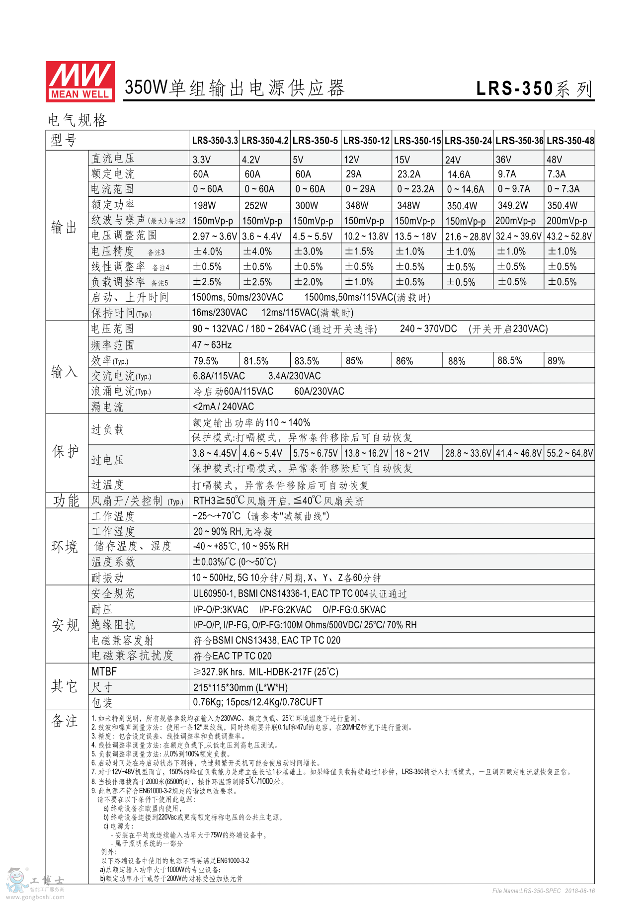 300VAC浪涌電流  LRS-350有風扇設計