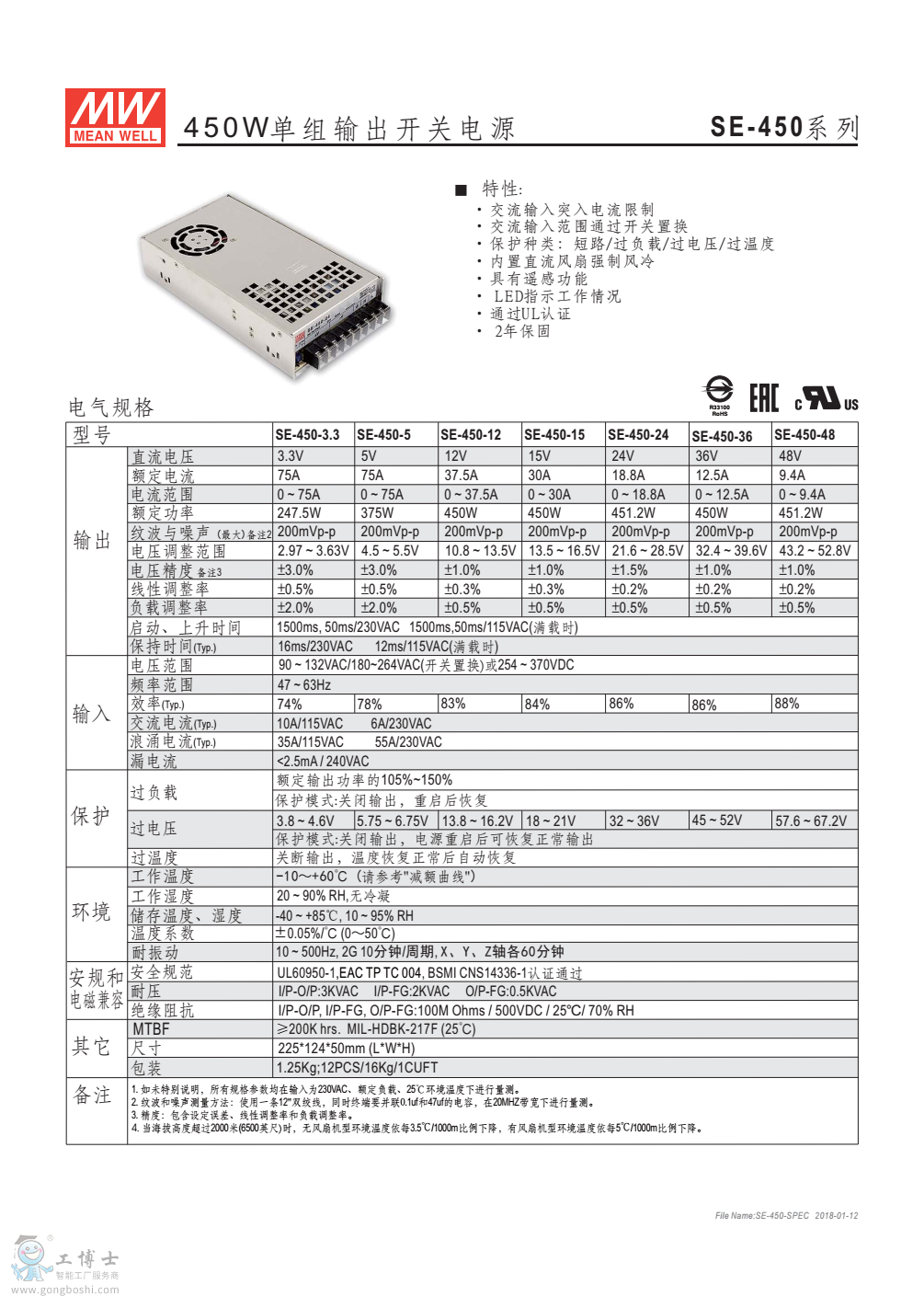 明緯開關電源SE-450-12 12V37.5A