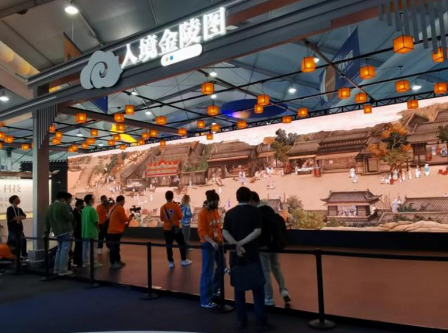 被譽為“南京版《清明上河圖》”的《仿楊大章畫<宋院本金陵圖>》被放大在了長近110米、高3.6米的大屏幕上,通過將室內高精度定位系統(UWB)、Unity引擎與自主研發的智能管理系統三端互聯互通,以“精確到個位數厘米級”的精準定位、自主決策的移動端交互模式,讓人們以第一人稱視角“走入”古畫。