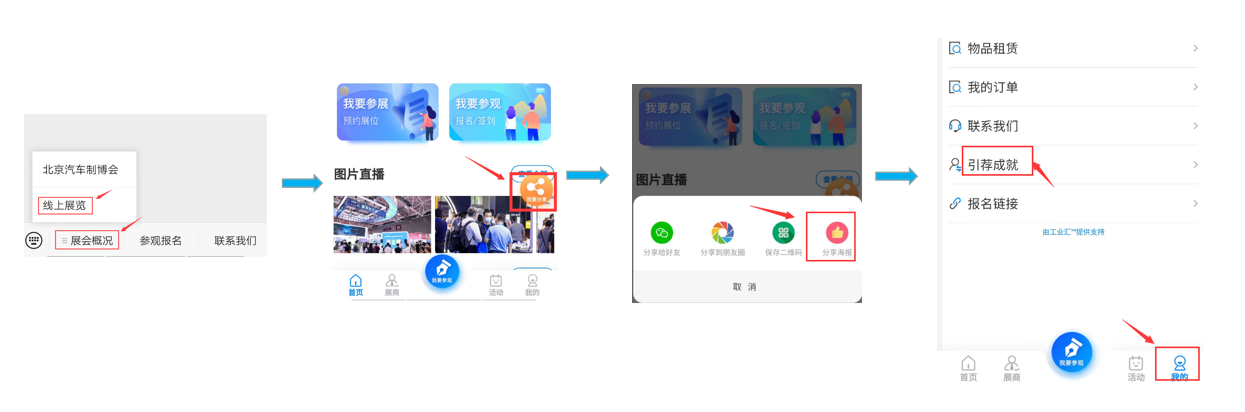 或者您進入微信公眾號菜單欄點擊“展會概況”點擊“線上展覽”在首頁右下角點擊“我要分享”選擇“分享海報”,將生成的圖片保存手機轉發給您的組團朋友即可,您可在“我的”中點擊“引薦成就”查看您的團隊成員報名情況。