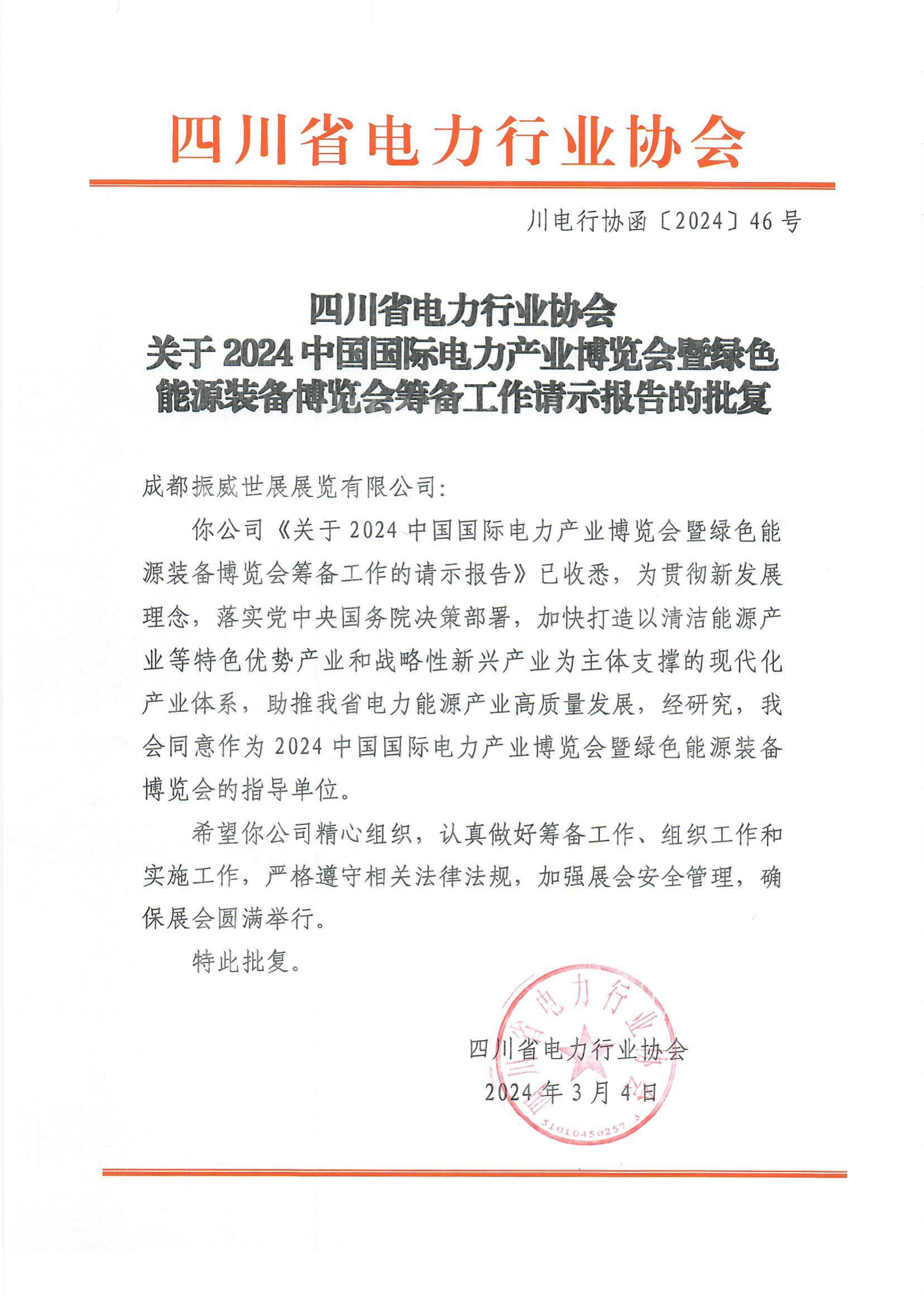 4月1日,中國國際貿易促進委員會電力行業委員會正式復函,同意作為2024中國國際電力產業博覽會暨綠色能源裝備博覽會的聯合主辦單位,將積極組織會員及相關單位參展、參觀,與成都振威世展展覽有限公司共同打造世界領先的電力能源行業“風向標”交流合作平臺。