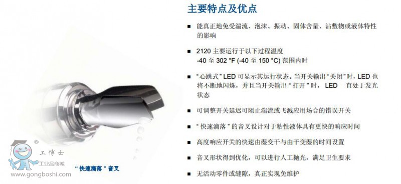 ※ “快速滴落”的音叉設計對于粘性液體具有更快的響應時間