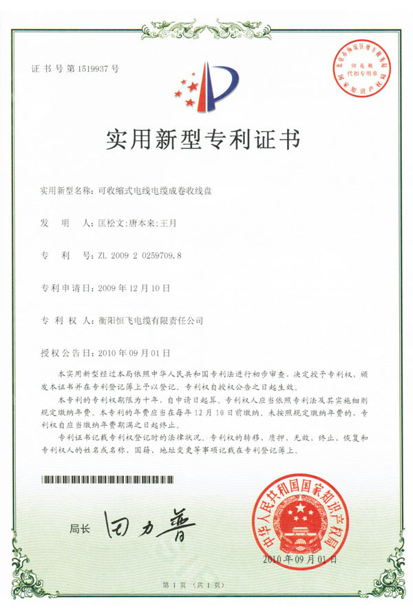 衡陽(yáng)恒飛電纜有限公司獲取各項(xiàng)專利證書
