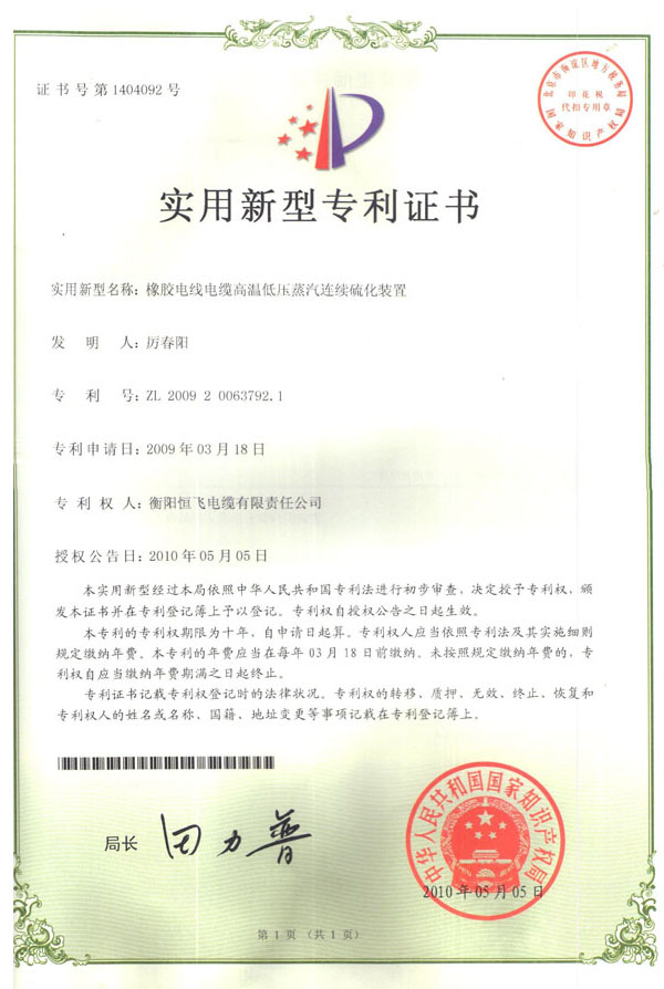 衡陽恒飛電纜有限公司獲取各項專利證書