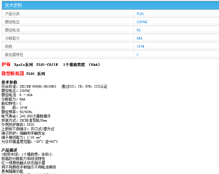 穆勒斷路器PL91-C6/1N