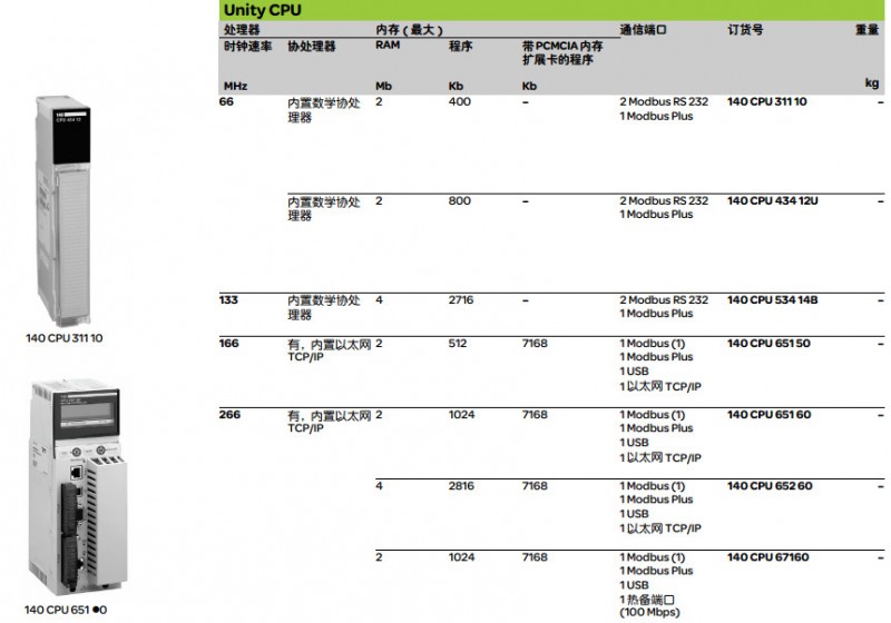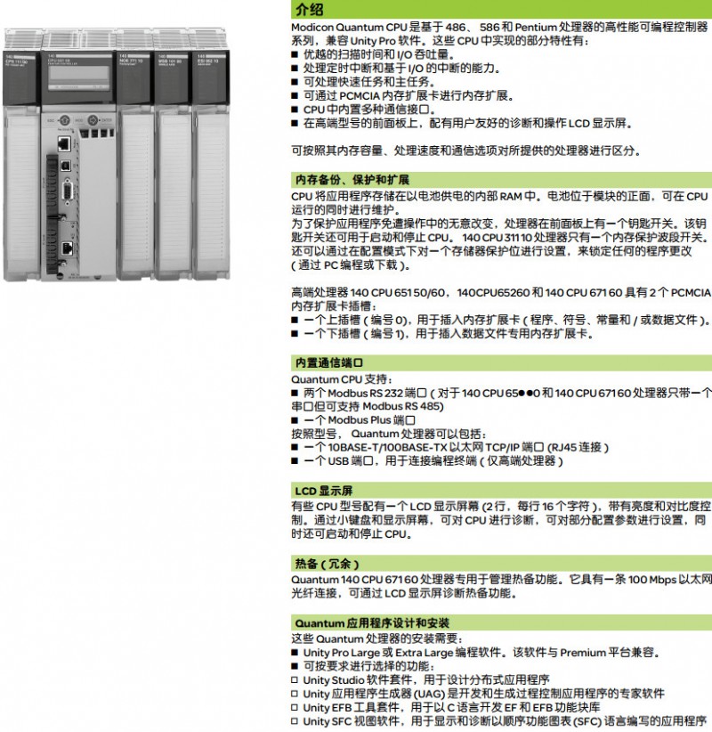 Modicon Quantum CPU 是基于 486、586 和 Pentium 處理器的高性能可編程控制器系列,兼容