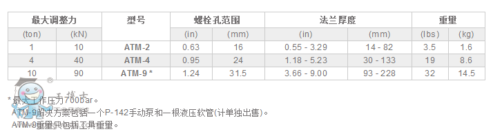 ATM-9機械法蘭調整工具具有與小型工具相同的功能,但可提供多可達10噸的調整力量。它與恩派克P-142雙速手動泵和液壓軟管組合形成套件。