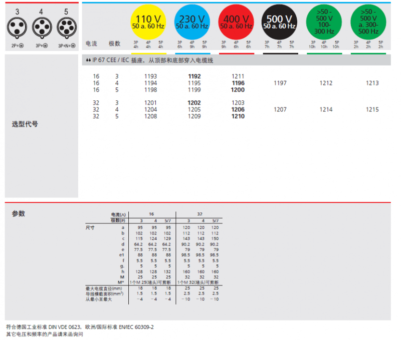 4、符合德國工業標準 DIN VDE 0623,歐洲/國際標準 EN/IEC 60309-2。