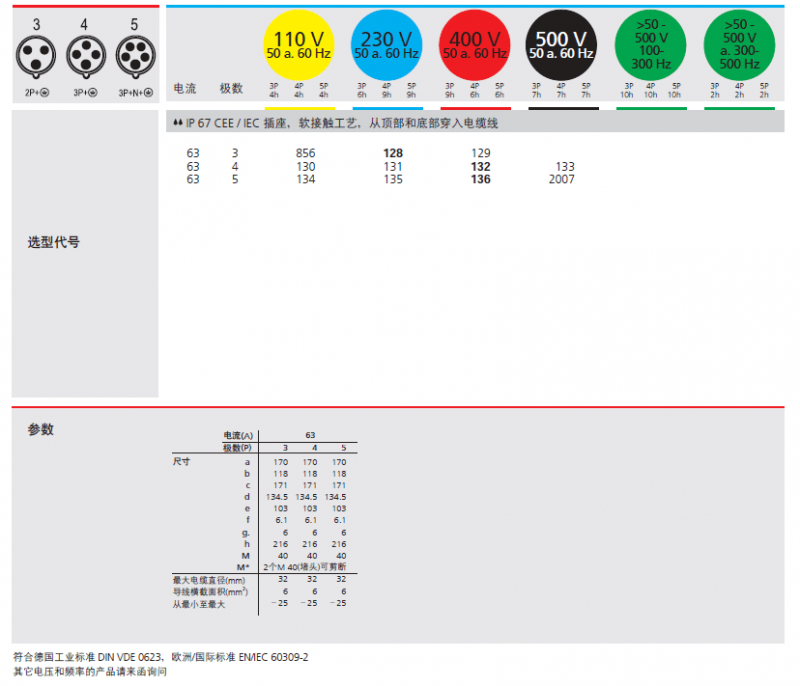 4、符合德國工業標準 DIN VDE 0623,歐洲/國際標準 EN/IEC 60309-2。