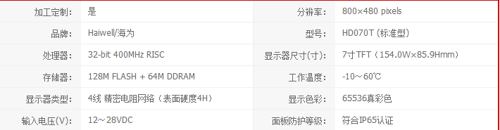 7英寸真彩TFT液晶(154.0W×85.9Hmm),分辨率800*480, 65536真彩色,高亮度背光,2個DB9端口(COM1:RS232/RS422/RS485,COM2:RS232C/RS485,可用于串口打印),2個 USB接口(USB-A: U盤數據存儲擴充、U盤程序下載;USB-B: USB程序下載),1個SD卡插槽,400MHZ CPU,128M FLASH,64M DDRAM。