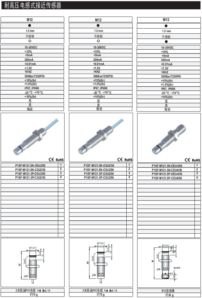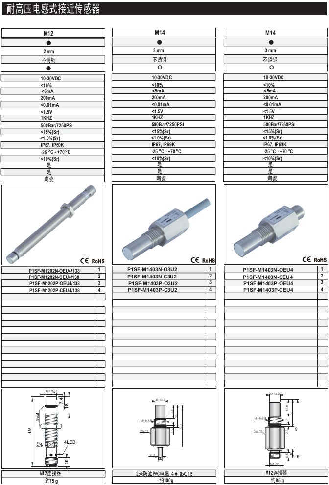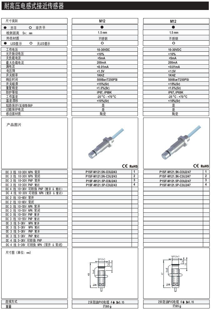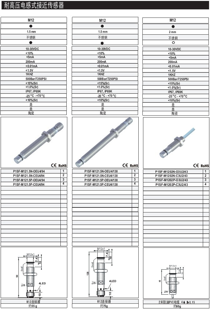 M12 1.5-2mm 齊平/非齊平 不銹鋼 體長:43.94.138mm M12插件式 耐高壓電感式接近傳感器