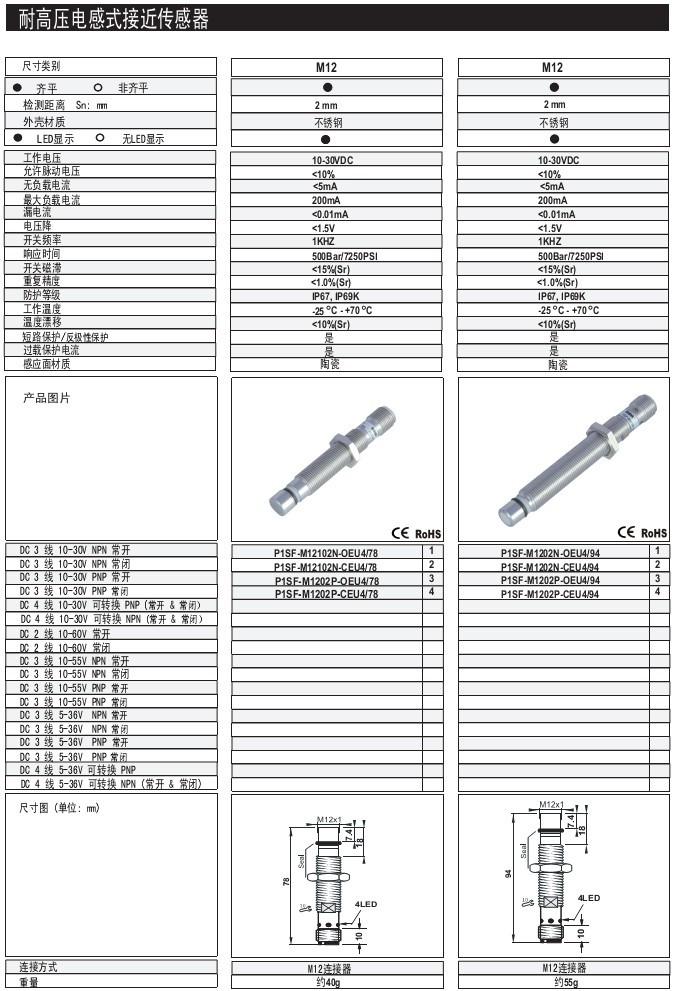 M12 2mm 齊平/非齊平 不銹鋼 體長:78.94mm M12連接器 耐高壓電感式接近傳感器