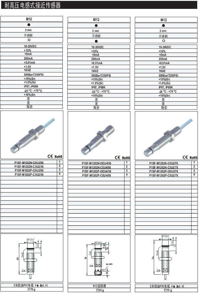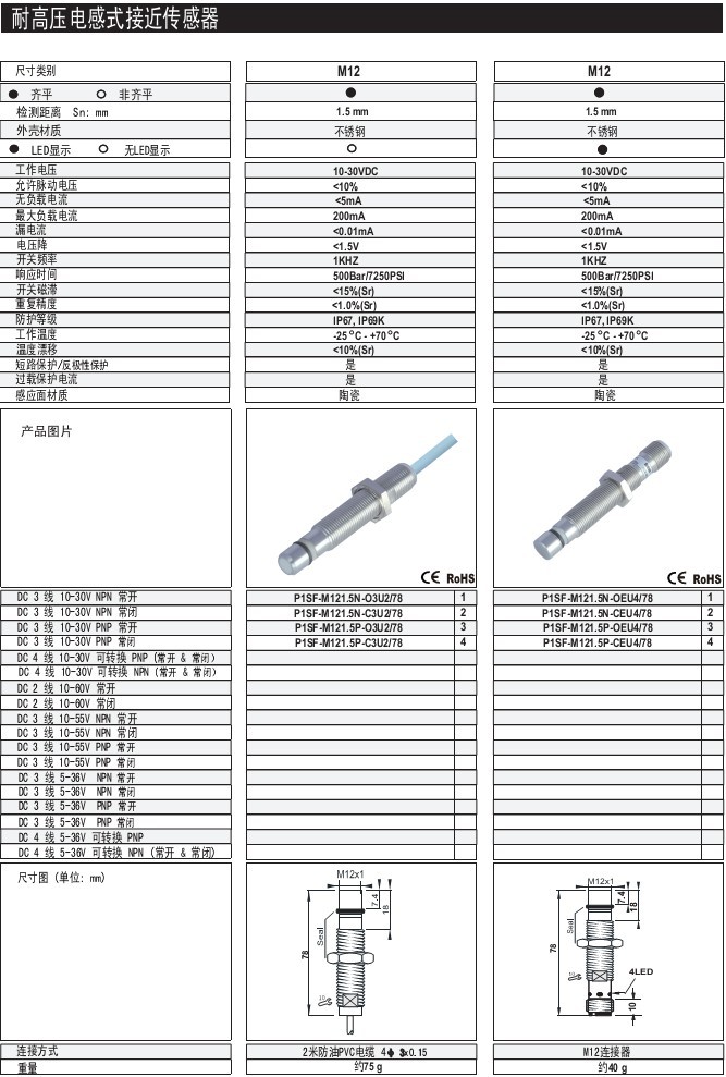 M12 1.5mm 齊平/非齊平 不銹鋼 體長:78mm 出線式 耐高壓電感式接近傳感器