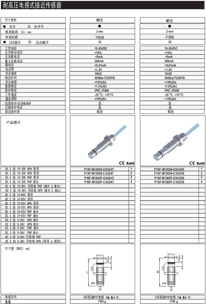 M12 2mm 齊平/非齊平 不銹鋼 體長:47.50mm 出線式 耐高壓電感式接近傳感器