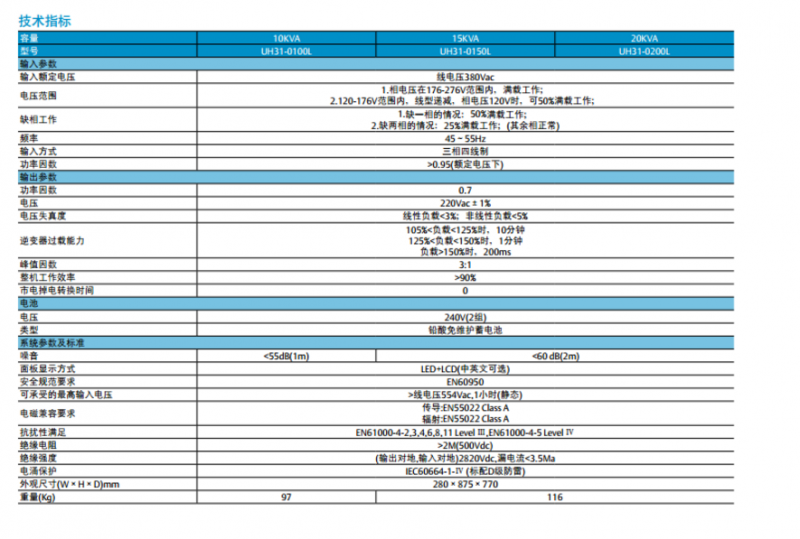 UH31系列UPS為三進單出型(三相輸入,單相輸出)智能高頻在線式交流不間斷電源系統,共有三個規格,額定輸出容量分別為10kVA15kVA20kVA。適用于小型計算機中心、網絡間、通信系統、辦公終端、醫療設備和精密儀器設備的交流供電。