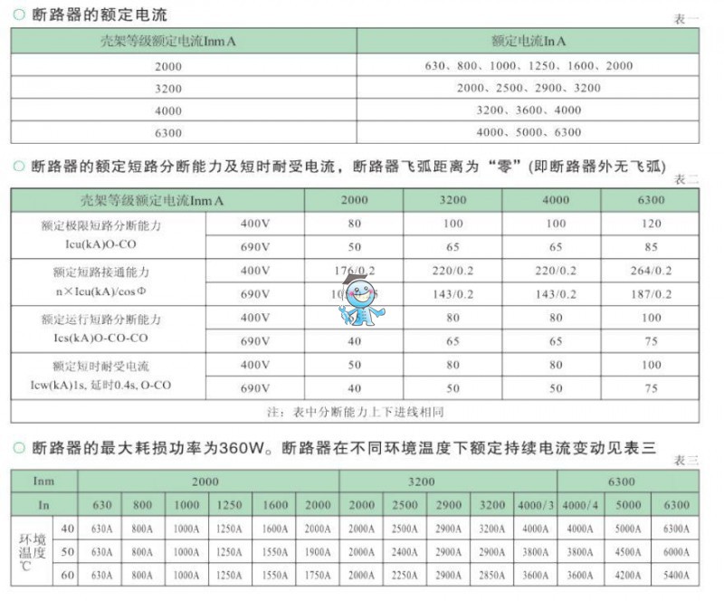 智能型萬能式斷路器(一下簡稱斷路器),適用于交流50HZ,額定電壓至660V(690V)及以下,額定電流630A~6300A的配電網絡中,用來分配電能和保護線路及電源設備免受過載、欠電壓、短路、單相接地等故障的危害。斷路器具有智能化保護功能,選擇性保護精確,能提高供電可靠性,避免不必要的停電。同時帶有開放式通訊接口,可進行“四遙”,以滿足控制中心和自動化系統的要求。斷路器在海拔2000米時脈沖耐壓8000V(不同海拔按標準修正,*高不超過12000V)。該斷路器不帶智能控制器及傳感器可作隔離器用,