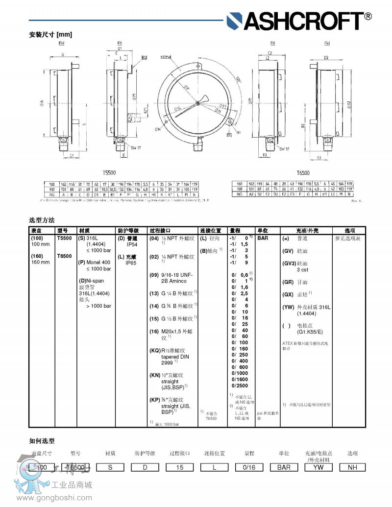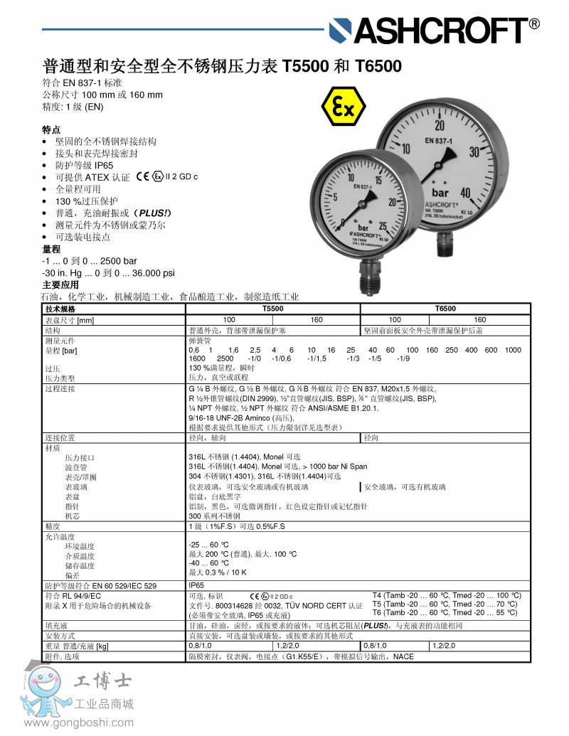 雅思科 普通型和安全型全不銹鋼壓力表T5500