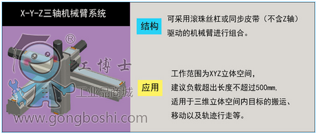 工作范圍為XYZ立體空間,建議負載伸出長度不超過500mm,適用于三維立體空間內目標的搬運、移動以及軌跡行走等。