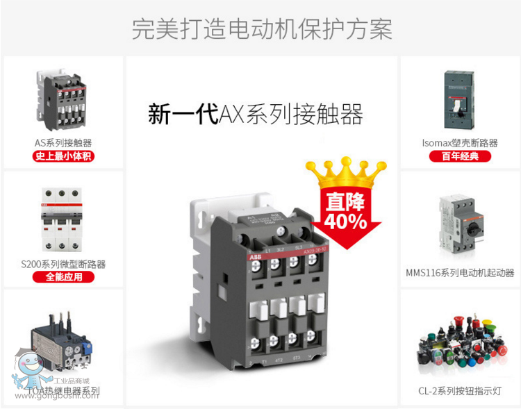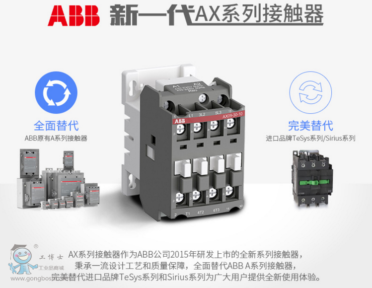 AX系列接觸器主要用于控制三相電動機以及額定工作電壓達 690 V / 1000 V AC 的電力線路,是ABB中國全面推動服務客戶的全新一代產品。