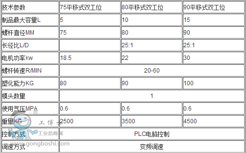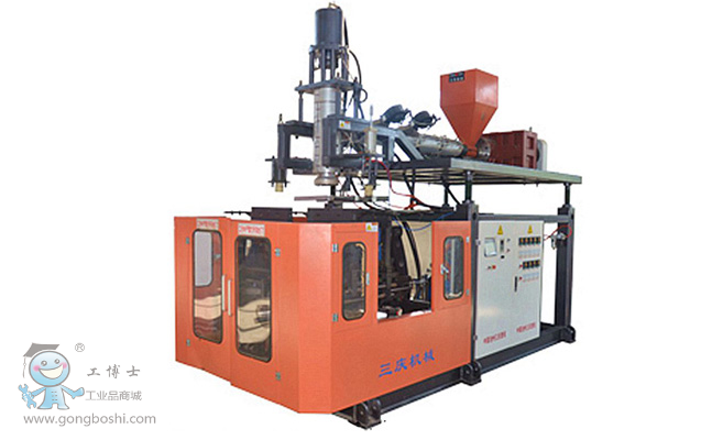 本機型是單模頭雙工位液壓合模、氣動移模吹塑機。適合吹制5-15升的PE/PP酒壺、機油壺、童車不見、異形部件等。本機可加裝壁厚控制器及儲料模頭,使設備壓料速度快、壁厚均勻,高效節能。