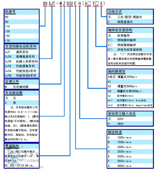 我公司研發生產的系列伺服電機為永磁交流伺服電機,采用高性能稀土永磁材料,功率密度高,過載能力強,反電勢正弦性好,低速特性好;支持220V和380V交流伺服驅動,電機的配件部分支持剎車、油封,電機編碼器配增量式或絕對式;電機座規格有:40mm、60mm、80mm、110mm、130mm、175mm。電機型號共分40SJTA系列、60SJTA系列、80SJTB系列、80SJTA系列、110SJT系列、130SJT系列、175SJT系列通用型交流伺服電機。