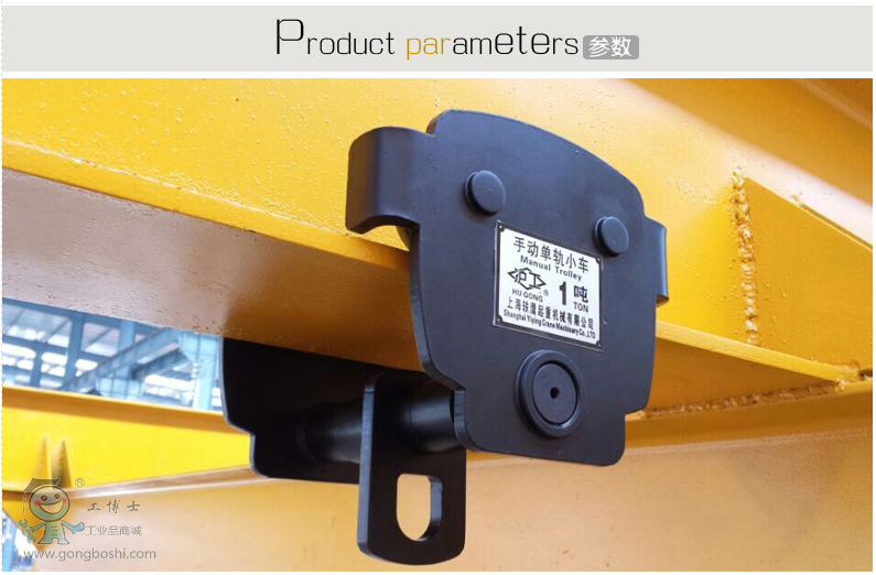 滬工新款手推小車表面黑漆處理,光亮持久,手推單軌小車以手推吊重物驅動,能自如地行走于工字鋼軌的下翼緣上,而且車輪輪緣間距可以按工字鋼軌道寬度要求調整,將手動葫蘆懸掛在行車下方,可組成手動起重運輸小車。