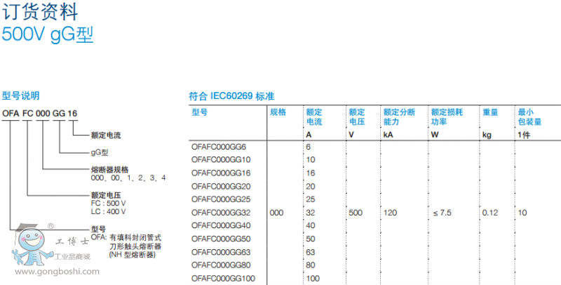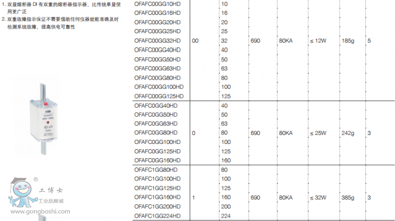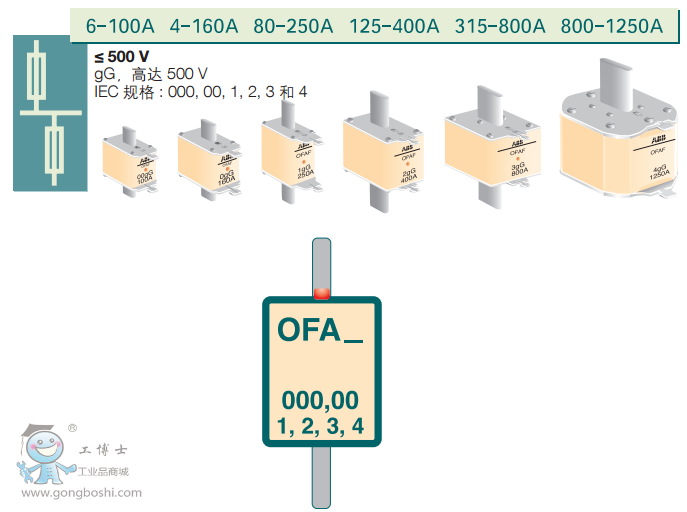 gG 型熔斷器分為500V和690V兩種,都是為了滿足現(xiàn)代化工業(yè)和電力系統(tǒng)要求設(shè)計(jì)的, 具備了分?jǐn)?高短路電流的能力。400V熔斷器的短路分?jǐn)嗄芰沙^100 kA。 另外,690V熔斷器分為雙顯和單顯熔斷器,雙顯全系列產(chǎn)品設(shè)計(jì)及工藝制造方法已獲得 10項(xiàng)專利,雙重保障知識保證不需要借助任何儀器準(zhǔn)確及時(shí)檢測系統(tǒng)故障,提供供電可 靠性。分?jǐn)嗄芰_(dá)到80KA。 快速熔斷器設(shè)計(jì)和測試按照IEC60269標(biāo)準(zhǔn)進(jìn)行。額定電壓達(dá)到690VAC,電流20- 1000A,分?jǐn)嗄芰Ω哌_(dá)200KA RMS Sym。 OFA_ 熔斷器規(guī)格 : 000, 00, 1, 2, 3 和 4。