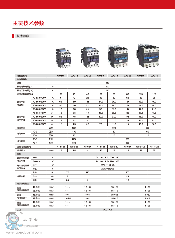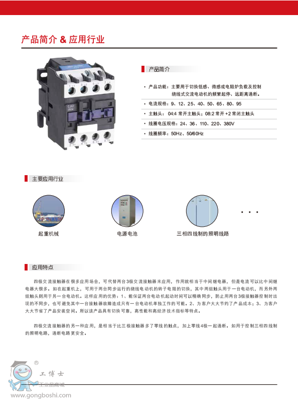 適用于交流50/60Hz、額定工作電壓*高至1000V,在AC-3使用類別下額定工作電壓為380V時額定工作電流至95A的電力