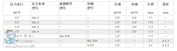 GA, NV, V-系列,壓力表附件