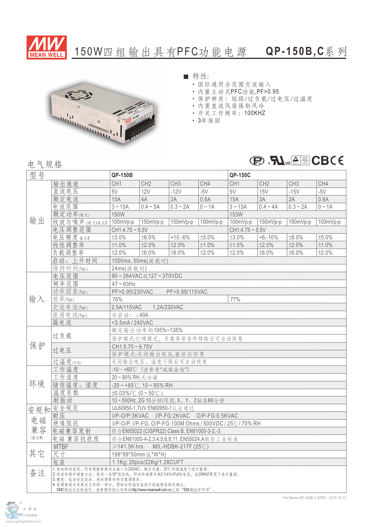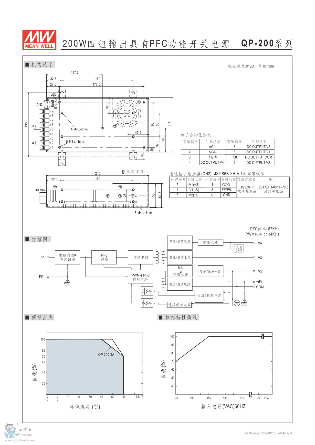 明緯QP-200-3A 200W四組輸出有PFC功能開關電源 PFC系列 |