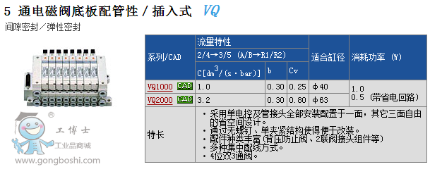 SMC 5通電磁閥底板配管性/插入式-VQ1000,VQ2000
