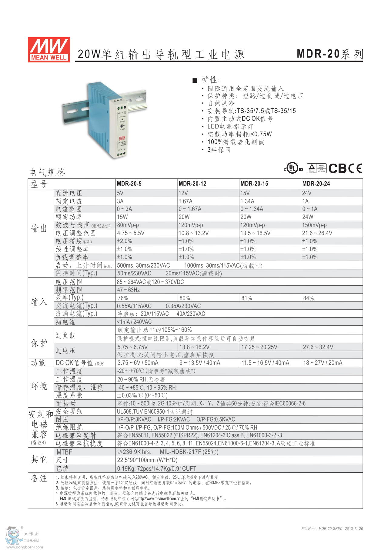 明緯MDR-20-12 20W單組輸出導軌式工業電源