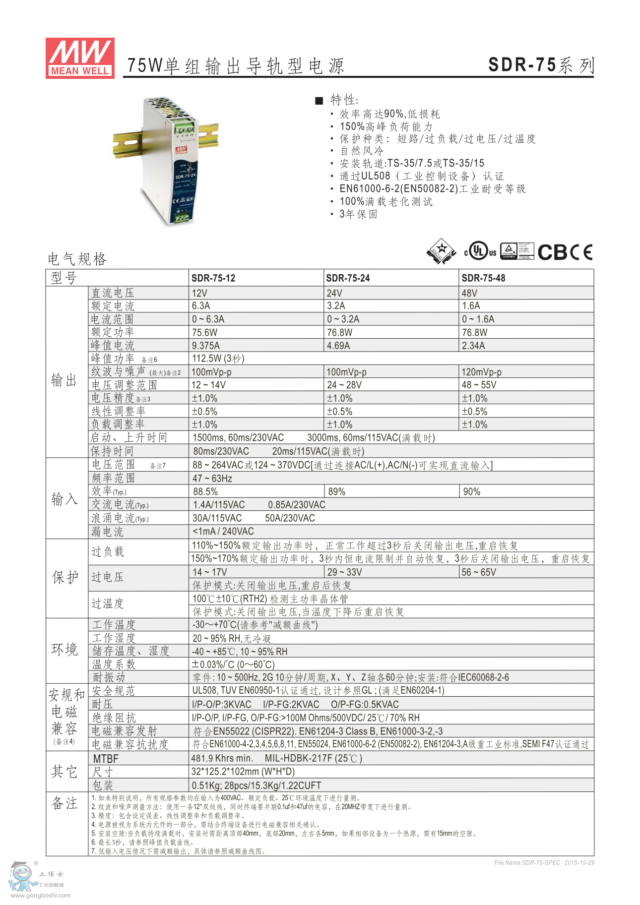 明緯工業(yè)電源SDR-75-12 75W單組輸出導(dǎo)軌式 |