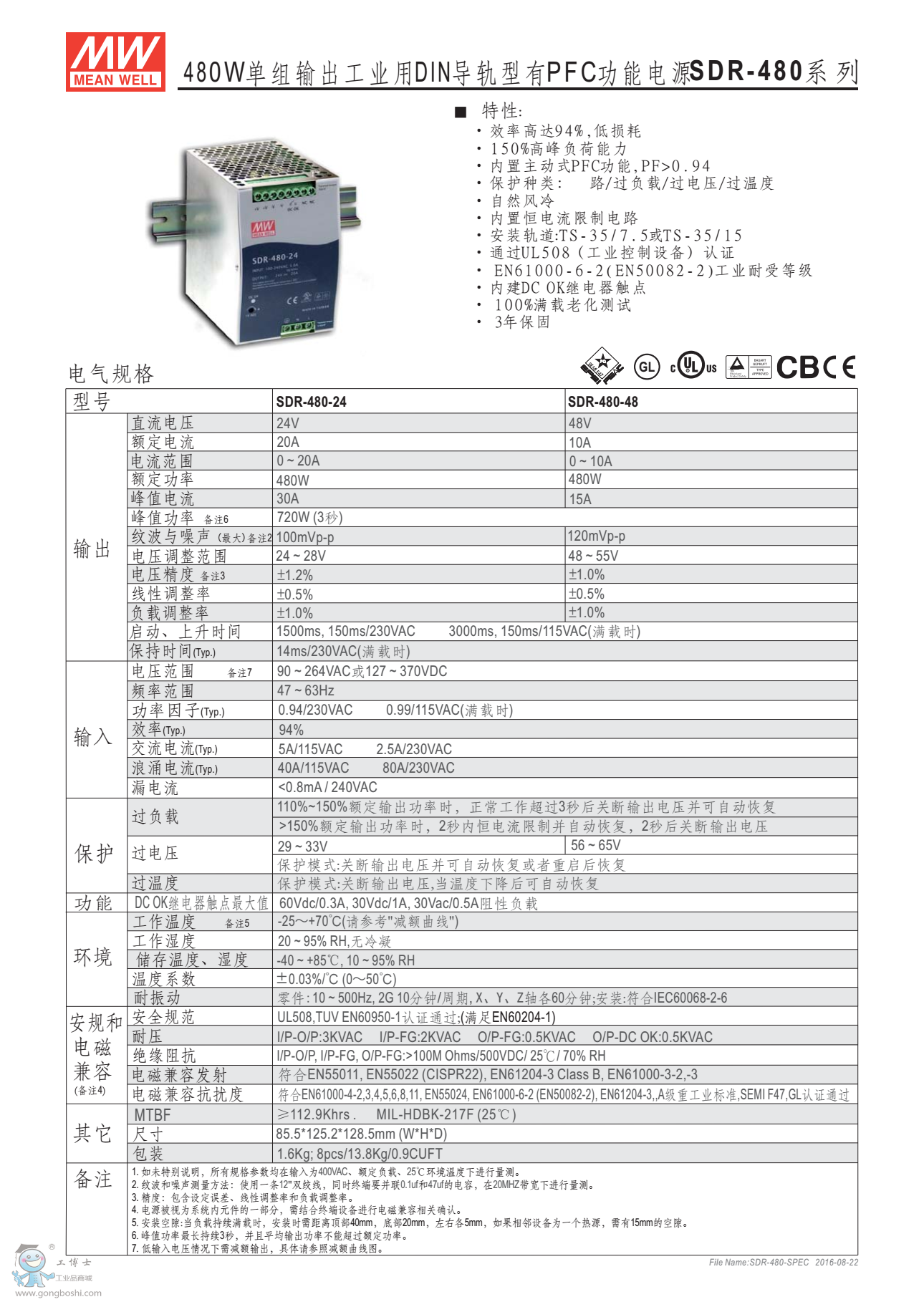 明緯工業電源SDR-480-24 480W單組輸出DIN導軌式 有PFC功能 |