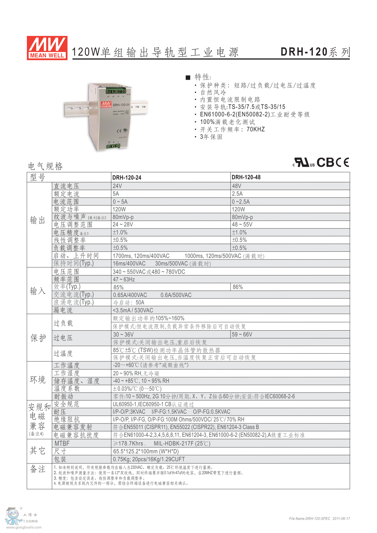 明緯導軌電源DRH-120-48 48V2.5A 480W單組輸出