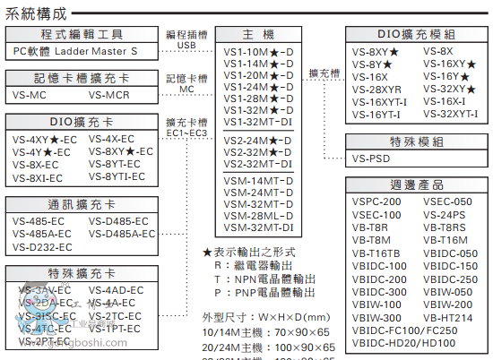 • 通用型VS2系列,適用于各種一般的自動控制系統(tǒng)。諸如,載客用升降機、橡膠加硫機、塑料射出成型機、金屬沖壓設(shè)備、包裝機械等,各種需要配合模擬量、溫度,較復(fù)雜程序控制的產(chǎn)業(yè)機械。