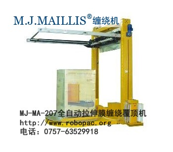 M.J.MAILLIS牌MJ-MA-207全自動(dòng)拉伸膜纏繞覆頂機(jī)/全自動(dòng)遙控纏繞覆頂包裝機(jī)械廠家/托盤膠膜纏膜+頂部覆膜一體機(jī)/棧板纏繞膜裹包機(jī)/卡板PE薄膜裹膜機(jī)/伸縮膜圍膜機(jī)/拉伸膜纏繞機(jī):裝有自動(dòng)上、斷、粘膜機(jī)構(gòu)及遙控裝置,操作人員可于叉車上或遠(yuǎn)程控制自動(dòng)運(yùn)行,實(shí)現(xiàn)垛型的四周纏膜及頂部覆膜。輕松實(shí)現(xiàn)防塵、防潮及美觀可靠的托盤包裝,提高包裝檔次。