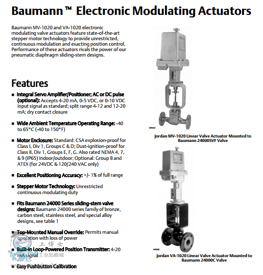 Baumann MV-1020 和 VA-1020 電動(dòng)調(diào)節(jié)閥執(zhí)行機(jī)構(gòu)采用*先進(jìn)的步進(jìn)電機(jī)技術(shù),實(shí)現(xiàn)不設(shè)限的連續(xù)調(diào)節(jié)和精確的位置控制。這些執(zhí)行機(jī)構(gòu)的性能可以我們的氣動(dòng)薄膜直行程閥門執(zhí)行機(jī)構(gòu)的設(shè)計(jì)性能相媲美。