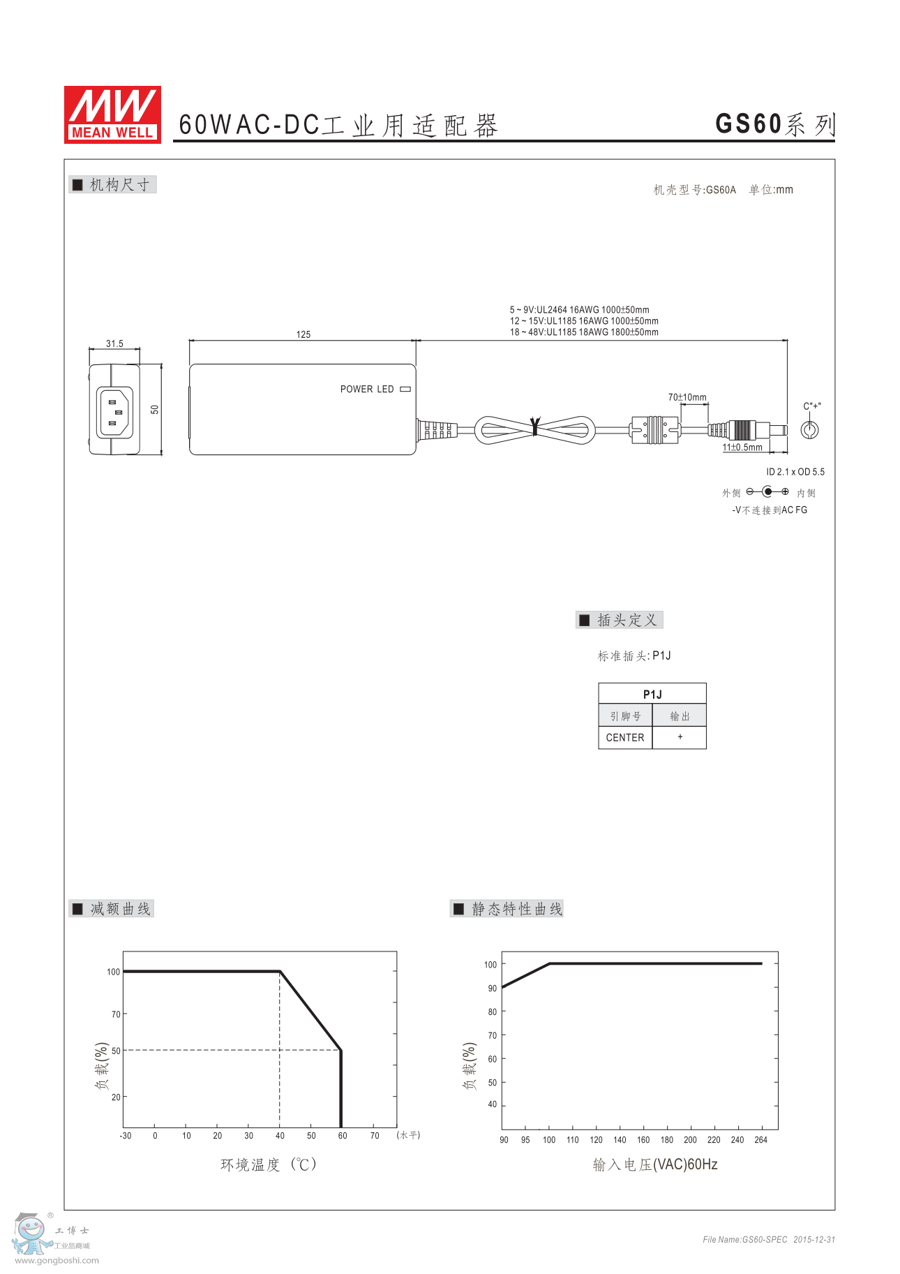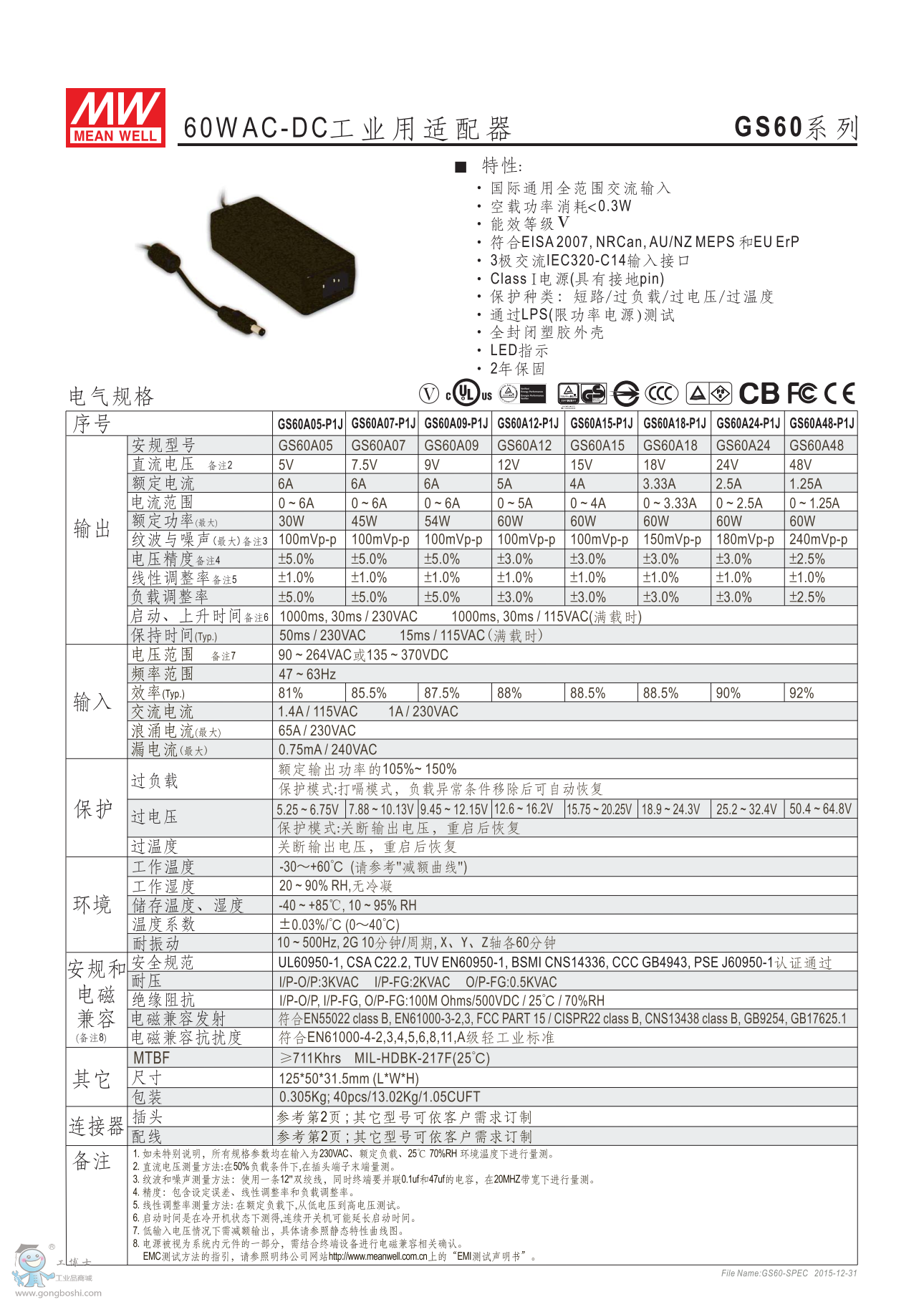 明緯電源適配器GS60A15-P1J 15V4A60W